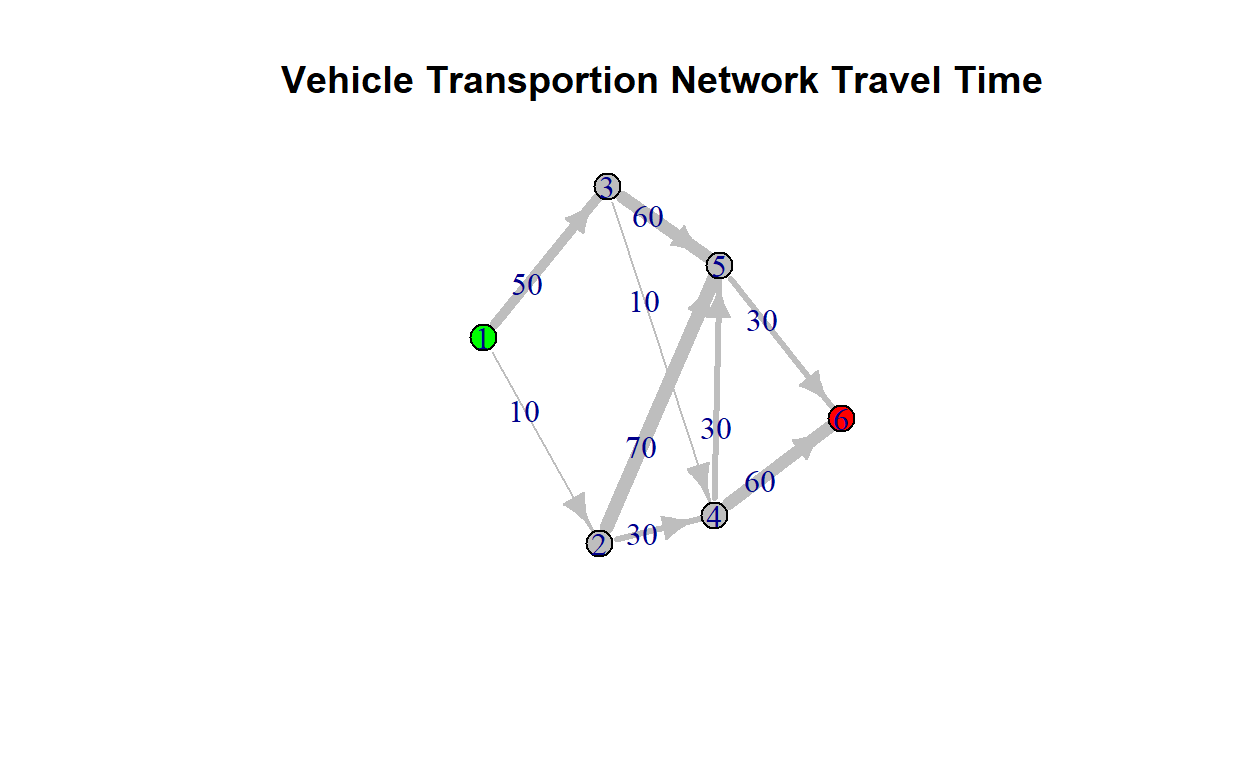 Road networks are everywhere in our society. In any given intersection there is a flow of cars, intersections with stop lights, and connections between each. Every road has a feasible limit it can support. In fact, this is often the cause of most congestion. Our goal is to minimize the total time required for all cars to travel from node 1 to node 6 in a fictitious road network.