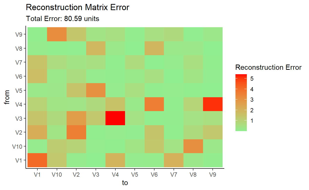 ggtitle("Reconstruction Matrix Error", subtitle = paste("Total Error: ", round(sum((as.matrix(X) - R)^2), 2), " units", sep="" ))